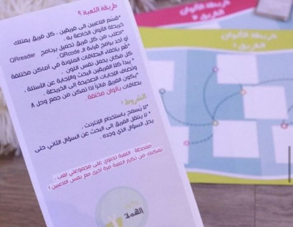 قسمّ أحبابك إلى فريقين، كل فريق سيحمل خريطةً ويبدأ برحلة البحث عن الشفرات الملونة ليبدأ بفكها بالإجابة على الأسئلة المرفقة وتدوين الجواب ✨